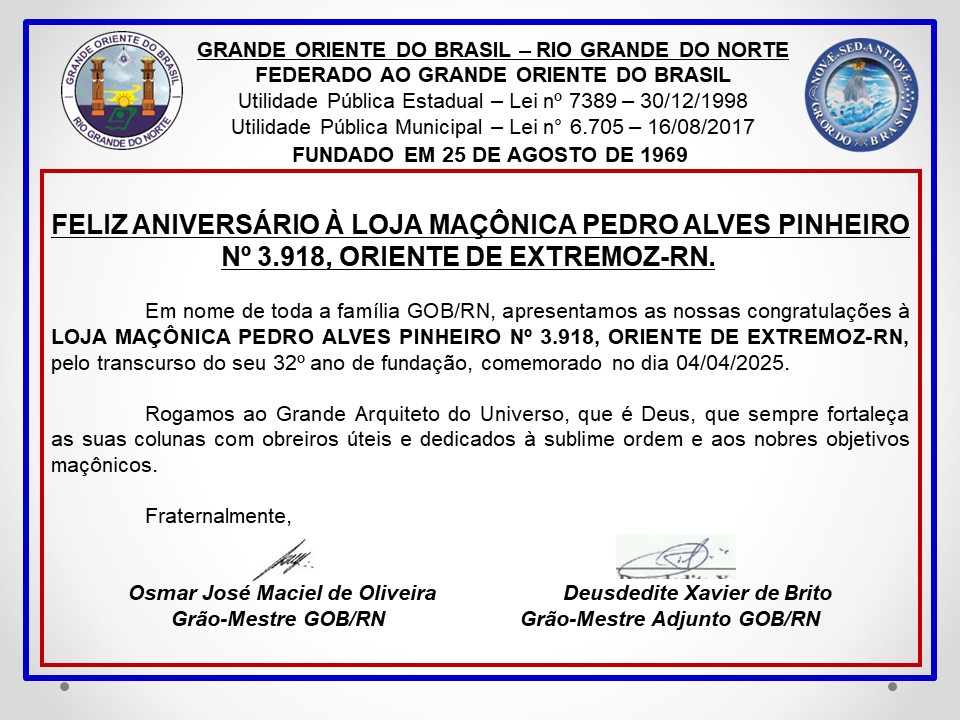 Na manhã do dia 05/04/2025 (sábado), o Eminente Irmão OSMAR JOSÉ MACIEL DE OLIVEIRA, Grão-Mestre do Grande Oriente do Brasil – Rio Grande do Norte (GOB/RN), teve a honra de presidir e conduzir a Sessão Magna de Iniciação realizada pela LOJA MAÇÔNICA FRATERNIDADE E JUSTIÇA III N° 1.757, ORIENTE DE CURRAIS NOVOS/RN. Na ocasião […]