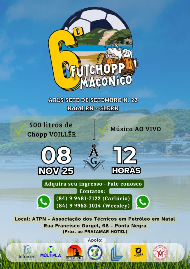 SEXTO FUTCHOPP MAÇONICO Deixe um comentário / Notícias do GOB-RN / GRANDE ORIENTE DO BRASIL - RN / dom, 26 de outubro de 2025 SEXTO FUTCHOPP MAÇONICO Read More »