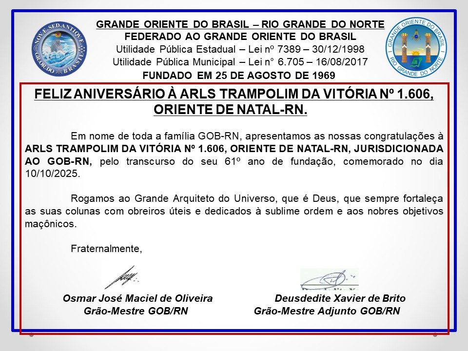 No dia 12/10/2025 (domingo), as LOJAS MAÇÔNICAS 21 DE MARÇO Nº 152 E DR. PEDRO GERMANO COSTA Nº 2.349, AMBAS DO ORIENTE NATAL-RN, exercendo as suas funções filantrópicas, sob a organização das FRATERNIDADES FEMININAS CRUZEIRO DO SUL – MENSAGEIRAS DA LUZ e ESTRELA POTIGUAR, e em parceria com o GRUPO ANDARILHOS, promoveram ação cívico […]