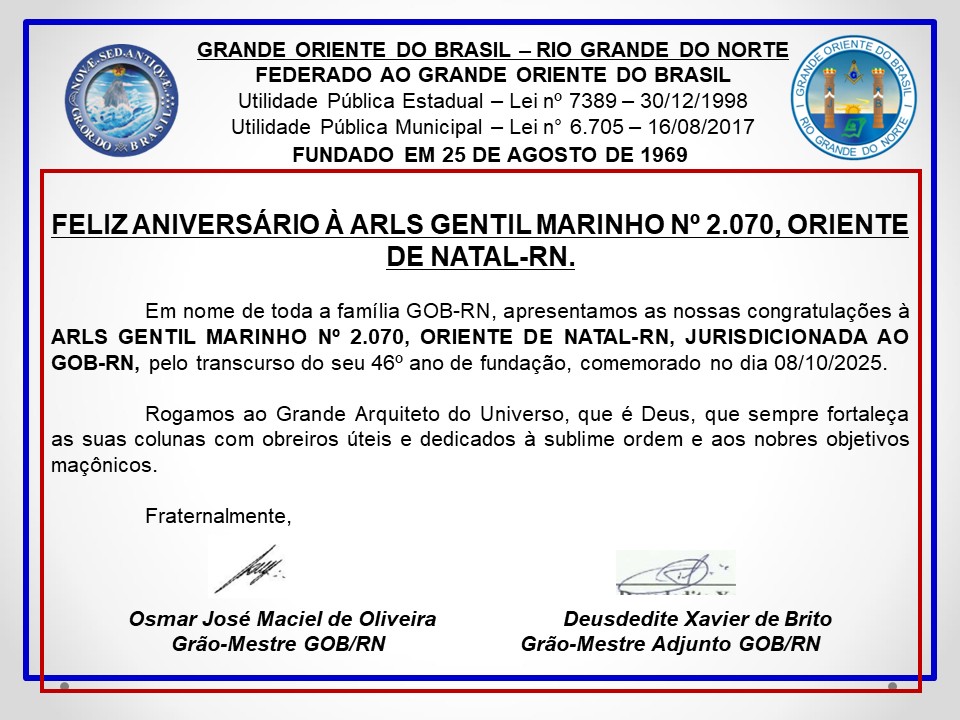 Na manhã do dia 09/10/2025 (quinta-feira), o Eminente Irmão OSMAR JOSÉ MACIEL DE OLIVEIRA, Grão-Mestre do Grande Oriente do Brasil – Rio Grande do Norte (GOB-RN), acompanhado pelo Poderoso Irmão NILO FERREIRA PINTO JÚNIOR, Presidente da Poderosa Assembleia Estadual Legislativa (PAEL-RN), e pelo Irmão RAFAEL ANTÔNIO FERNANDES, Presidente de Honra da PAEL-RN, recebeu a