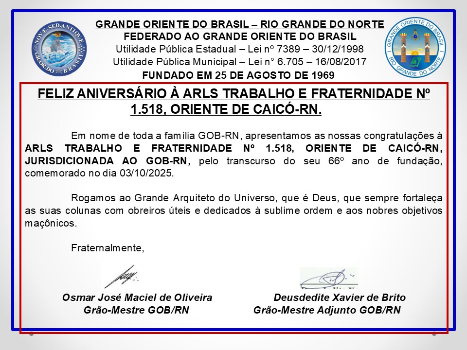 FELIZ ANIVERSÁRIO Deixe um comentário / Notícias das Lojas / GRANDE ORIENTE DO BRASIL - RN / sex, 03 de outubro de 2025 FELIZ ANIVERSÁRIO Read More »
