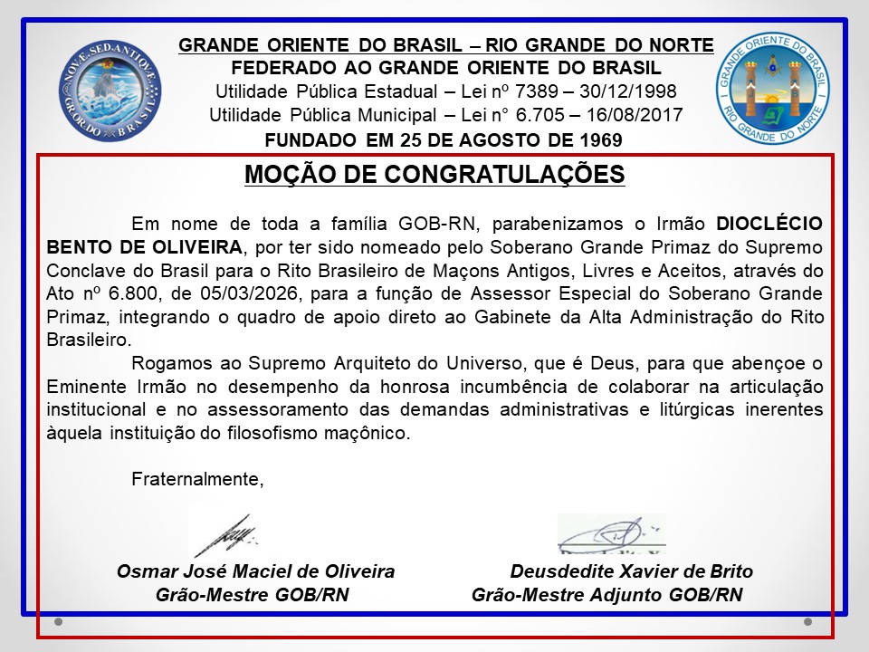Na noite do dia 05/03/2026 (quinta-feira), o Eminente Irmão OSMAR JOSÉ MACIEL DE OLIVEIRA, Grão-Mestre do Grande Oriente do Brasil – Rio Grande do Norte (GOB-RN), presidiu a SESSÃO MAGNA PÚBLICA EM HOMENAGEM À CRIAÇÃO DO CENTRO DE ESTUDOS MAÇÔNICOS, realizada pela Loja Maçônica JOÃO CECÍLIO DA COSTA N° 2.116, ORIENTE DE NATAL-RN.
