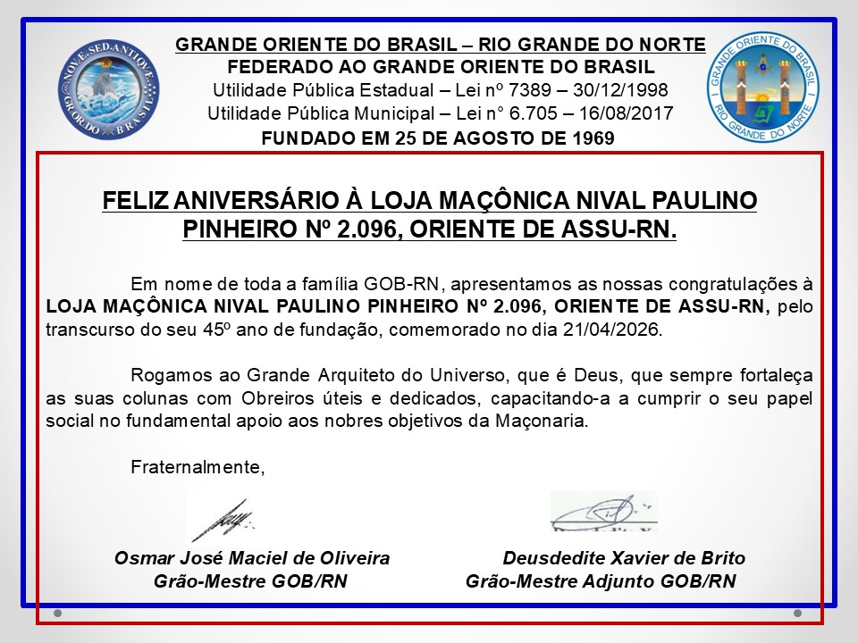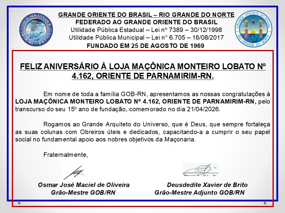 LOJA MAÇÔNICA MONTEIRO LOBATO N° 4.162, ORIENTE DE PARNAMIRIM/RN – SESSÃO ORDINÁRIA DE INSTRUÇÃO, NO GRAU DE APRENDIZ MAÇOM.