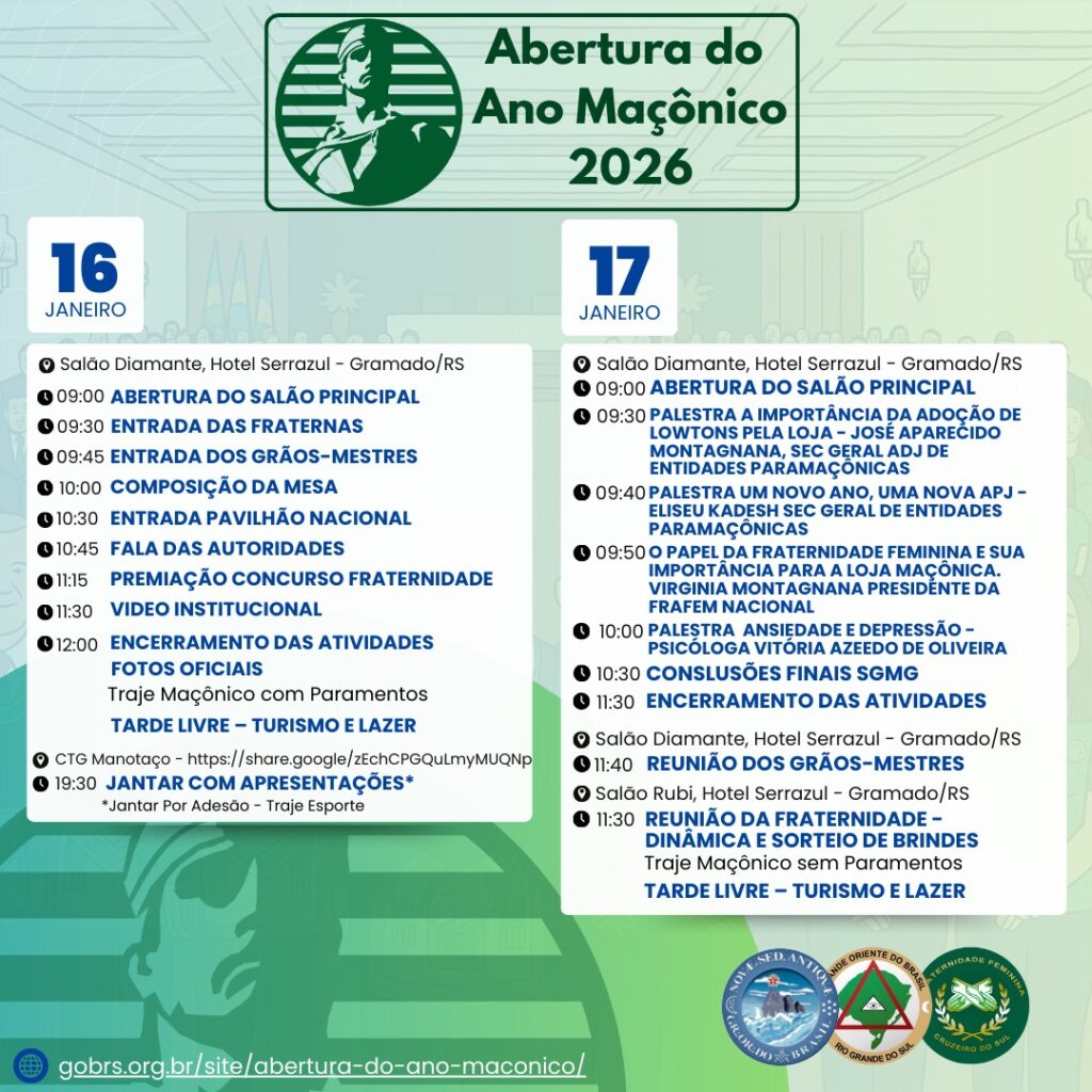 Nos dias 16 e 17/01/2026, o Eminente Irmão OSMAR JOSÉ MACIEL DE OLIVEIRA, Grão-Mestre do Grande Oriente do Brasil – Rio Grande do Norte (GOB/RN), o Poderoso Irmão DIOCLÉCIO BENTO DE OLIVEIRA (Deputado Federal Maçônico) e a Cunhada MARIA DAS NEVES DE MACEDO VIRGÍNIO, participaram das atividades relativas à ABERTURA DO ANO MAÇÔNICO 2026 DO GRANDE ORIENTE DO BRASIL (GOB), ocorridas na cidade de Gramado/RS.