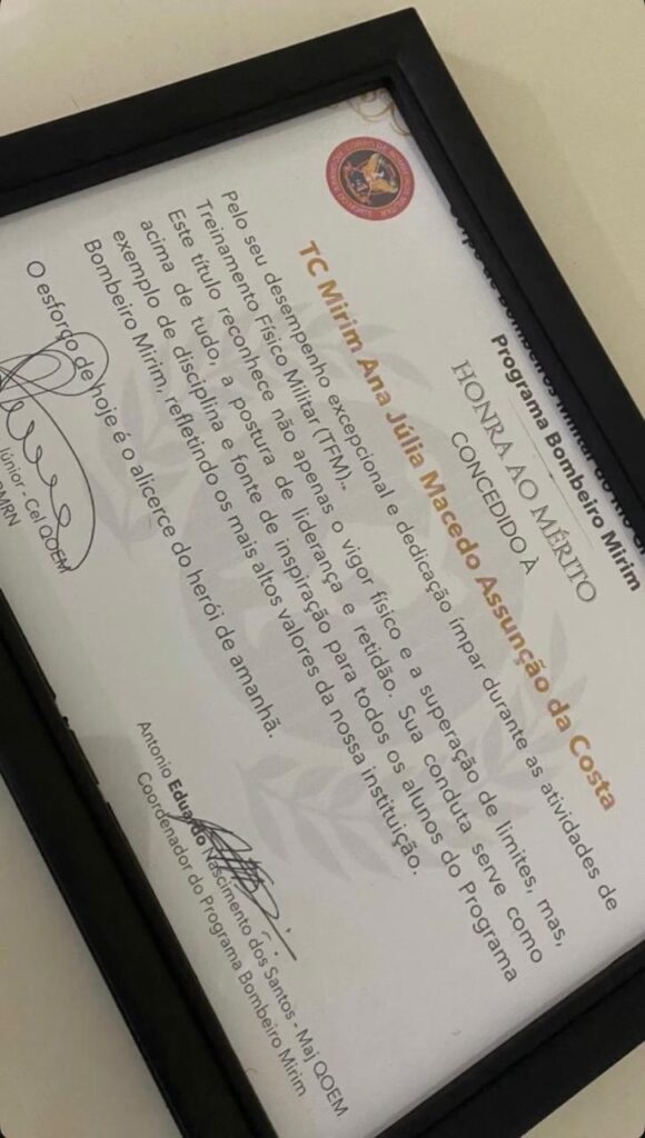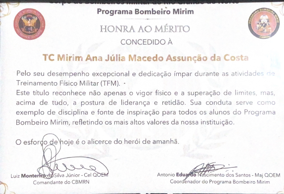 No dia 07/03/2026 (sábado), a nossa Sobrinha e Filha de Jó ANA JÚLIA MACÊDO ASSUNÇÃO DA COSTA, filha de nosso Irmão MARCOS FÉLIX DA COSTA JÚNIOR, Venerável Mestre da Universitária Estrela Natalense nº 4.122, Oriente de Parnamirim/RN, e de nossa Cunhada RANIELLY FABIANNY DE MACEDO ASSUNÇÃO, foi agraciada pelo PROGRAMA BOMBEIRO MIRIM, com o TÍTULO DE HONRA AO MÉRITO, em reconhecimento ao seu vigor físico, espírito de superação, postura de liderança e retidão, servindo de exemplo de disciplina e fonte de inspiração para os demais alunos.